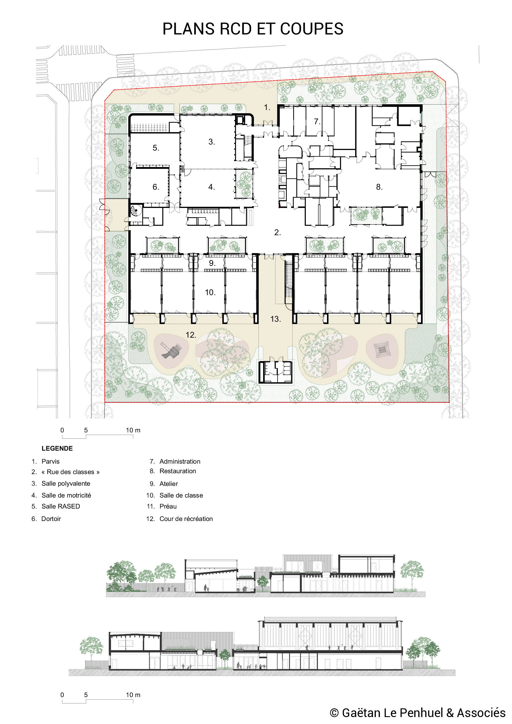 L’ensemble prend place dans une ambiance intérieure naturelle et enveloppante, où dominent le bois et la terre crue. À l’extérieur côté rue, les façades en pierre massive forme un écran protecteur donnant sur un parvis arboré, dont les abords ont été réaménagés par la municipalité pour renforcer la sécurité d’accès des enfants et favoriser les mobilités douces.
